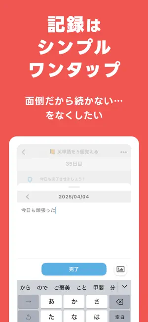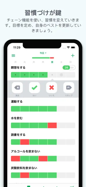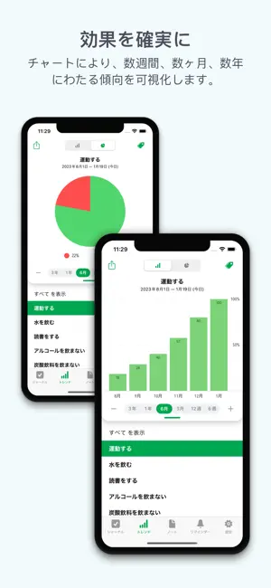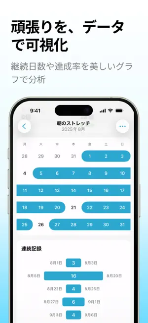 シンプルな操作で日々の習慣を記録でき、達成状況が美しいグラフで表示されます。