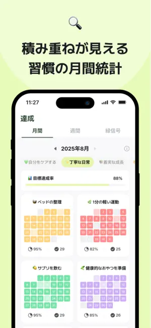 どの時間帯に習慣を達成しやすいか、どのカテゴリーの達成率が高いかなどを分析できます。